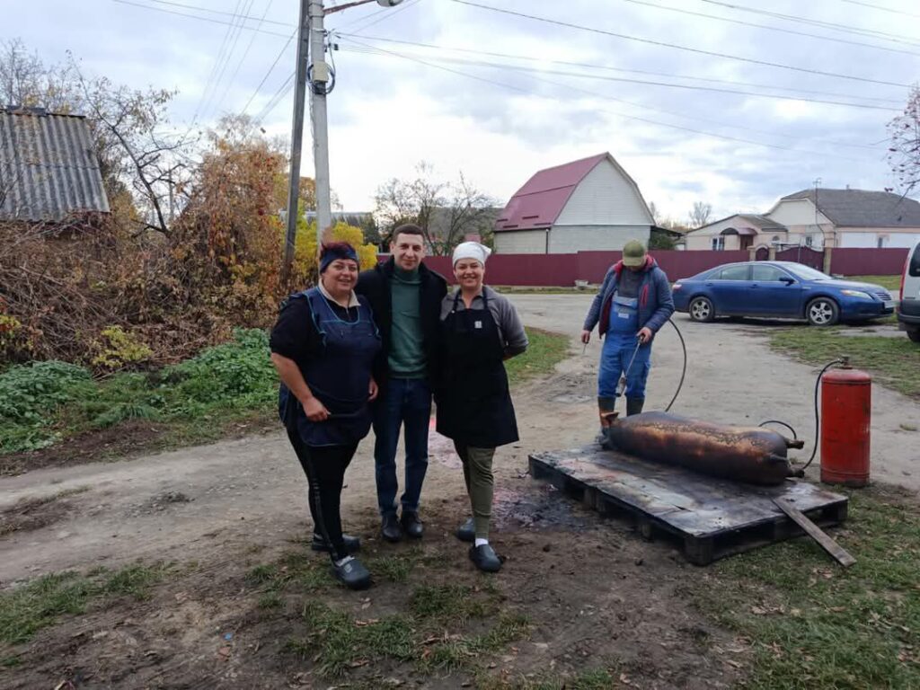 А керівник Козятинського осередку Олександр Сауляк допомогу надав сировиною: передав волонтерам «Міцного Тилу» тушку поросяти для приготування поживних обідів воїнам передової.